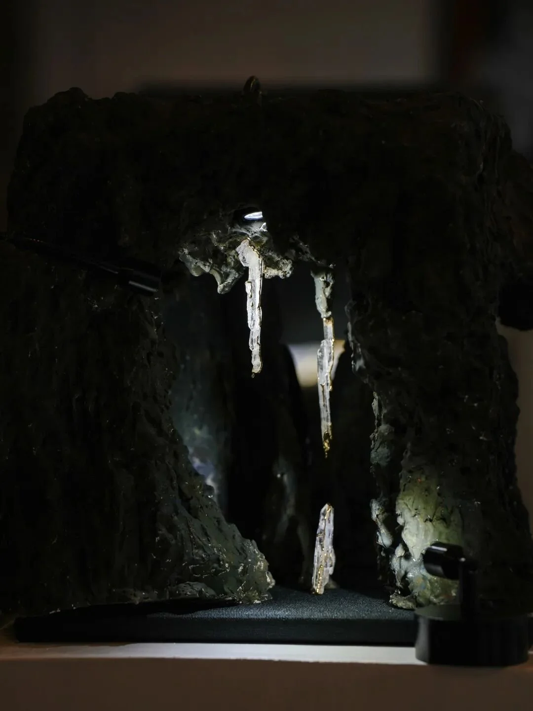Opposite, Tears of Antarctica carries the promise of dawn. Its melted gold edges and crystalline surfaces capture the fragile power of hope, the instant when frozen matter yields to light. Within the cave, its radiance unfolds like a breath of renewal — the slow awakening that restores movement to what was once silent and inert.