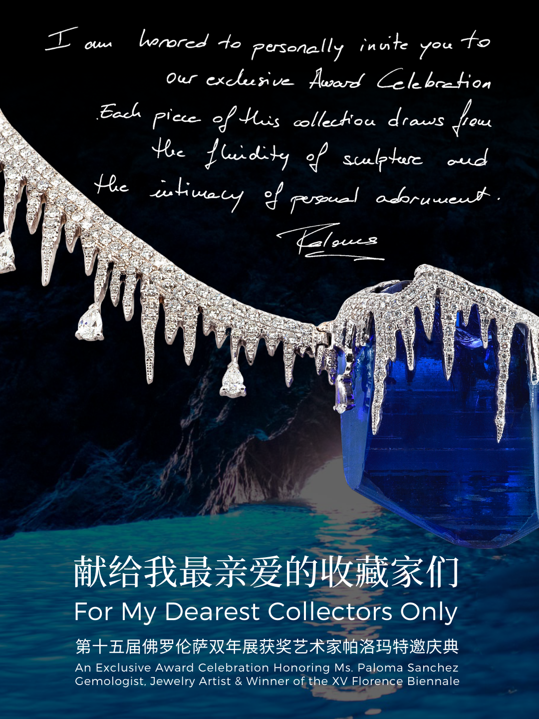 Founder & CEO of Paloma Sanchez, The Art of Jewelry, GIA gemologist and jewelry artist Ms. Paloma Sanchez has been honored with “The Living Trace” Award (the equivalent of the “Lorenzo il Magnifico” President’s Award) by the Florence Biennale (Italy) and Cluster Contemporary Jewellery Fair (London, UK) at the XV Florence Biennale, becoming the first artist in the history of the Florence Biennale to receive this distinction.