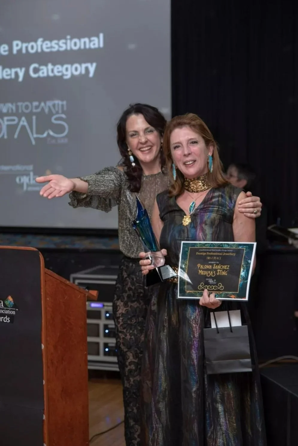 ▲Mrs. Vicki Bokros presenting the Award to Mrs. Paloma Sanchez. Mrs. Bokros donated the 22,27cts opal (valued $8,000) which was the prize given to Mrs. Paloma Sanchez.